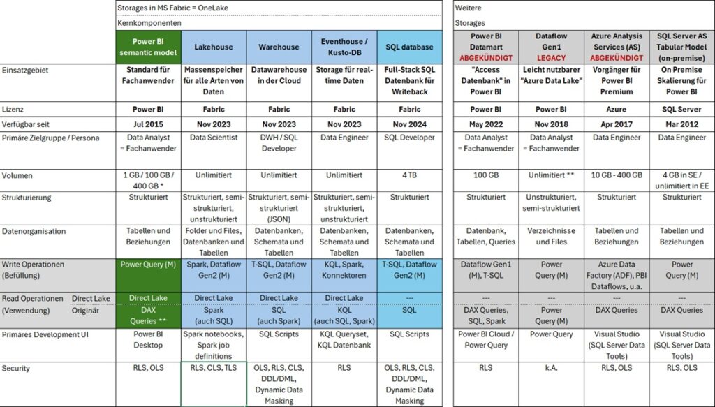 Aktuell sind diese Datenspeicher für Power BI mit folgender Kurzcharakterisierung verfügbar (die Darstellung wurde am 23.01.2026 aktualisiert):