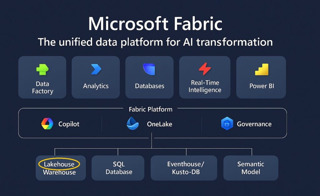 Das Lakehouse ist der zentrale Datenspeicher für analytische Aufgaben in in OneLake und damit in MS Fabric – hier werden alle Daten für BI, KI und Datenanalyse als single-point-of-truth gesammelt. Das Lakehouse kombiniert die Vorteile eines Data Lake (offen, skalierbar, rohdatentauglich) und eines Data Warehouse (strukturierte, performante Abfragen) in einer einheitlichen Architektur. Die Daten werden im Delta- und Parquet-Format (= offene Standards) gespeichert, die gleichermaßen von Spark, SQL („SQL Endpoint“) und Power BI („Direct Lake“) gelesen werden können. Das Lakehouse steht für die Modernisierung klassischer Datawarehouse Architekturen hin zu offenen, cloud-basierten Modellen.
