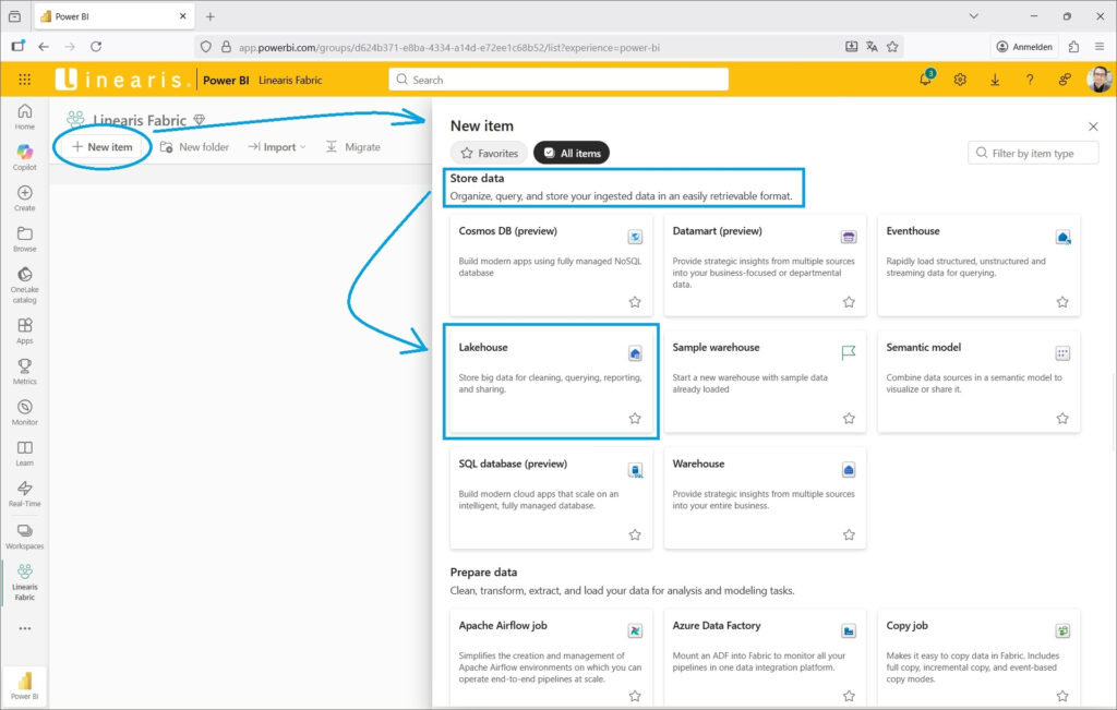 Das Lakehouse wird ganz einfach über den Button New Item in der Rubrik Store Data ausgewählt: