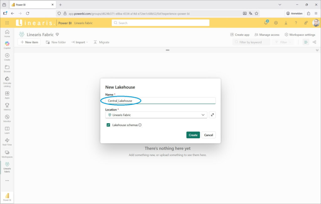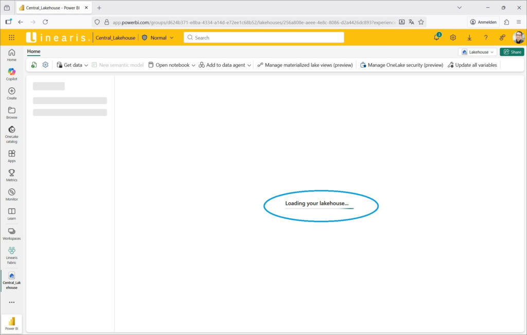 Das Lakehouse ist in maximal 1 Minute angelegt, es muß lediglich das Objekt „Lakehouse“ ausgewählt und ein Name vergeben werden. Manchmal bleibt die Navigation zwischen den Objekten stecken, dann muß nur kurz mal der Browser aktualisiert werden, damit wieder alles wie gehabt funktioniert.