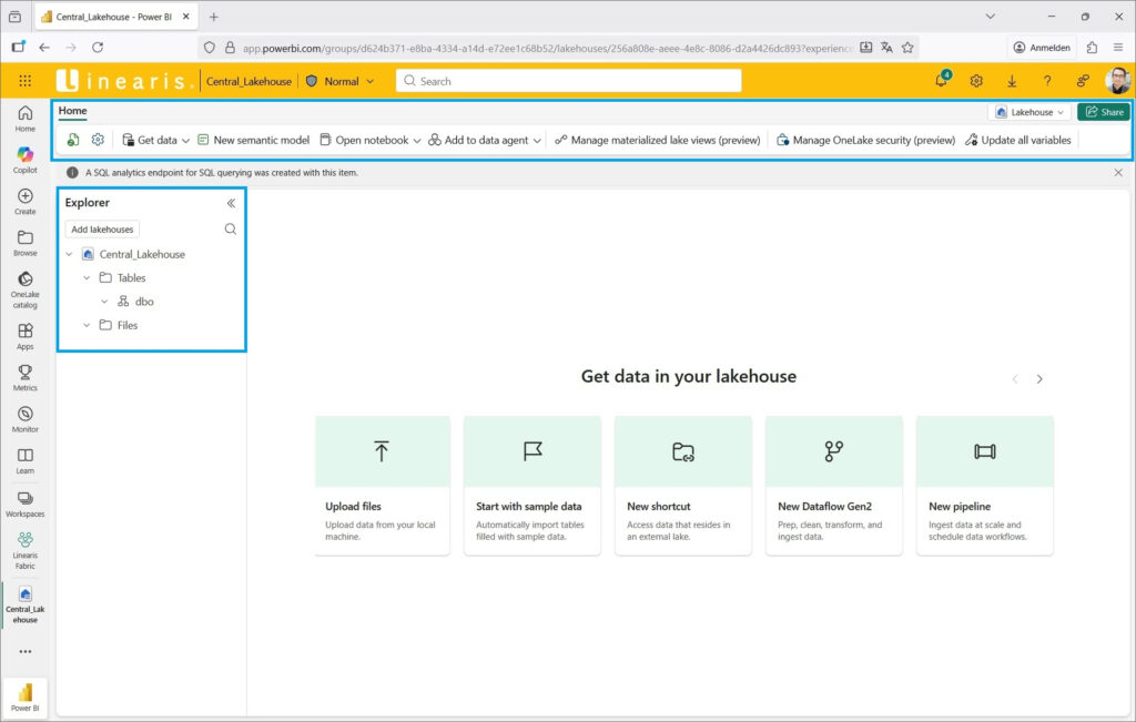 … und schon steht das fertige und natürlich noch leere Lakehouse zur Verfügung. Dabei ist bereits die Zweiteilung des Lakehouse in Tables (= strukturierte Daten) und Files (= unstrukturierte Daten) gut zu sehen: