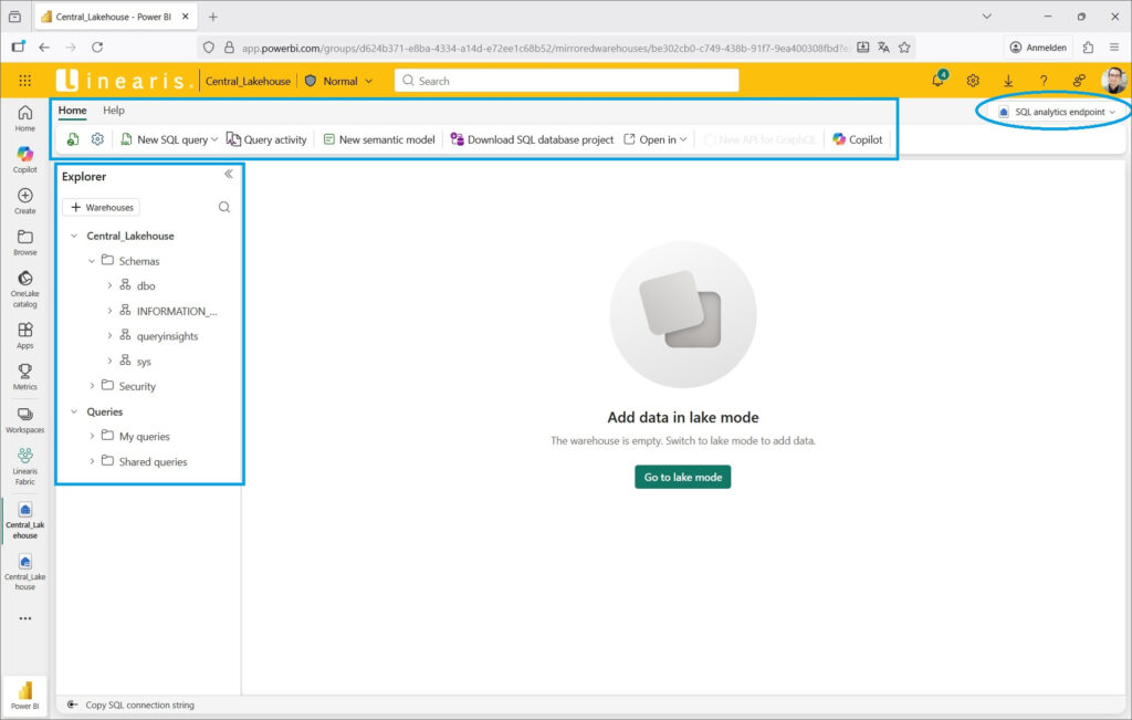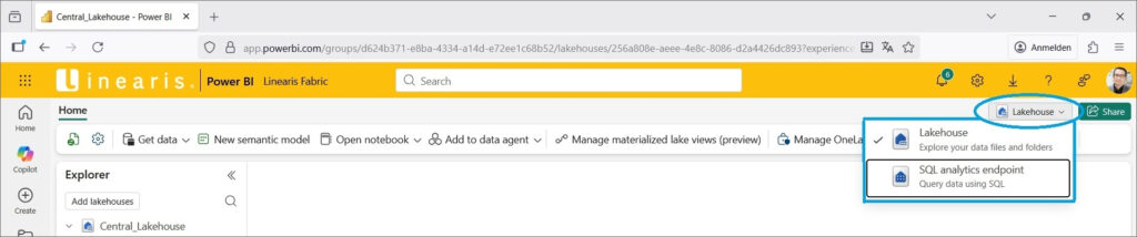 Über den Selektor rechts oben kann die Sicht auf das Lakehouse auf den SQL analytics endpoint gewechselt werden …