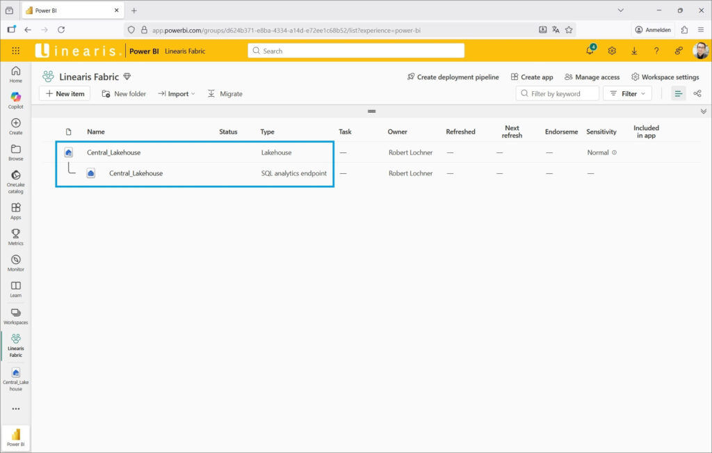 Auf Workspace Ebene bildet das Lakehouse das Hauptobjekt und der SQL analytics endpoint das abhängige Objekt: