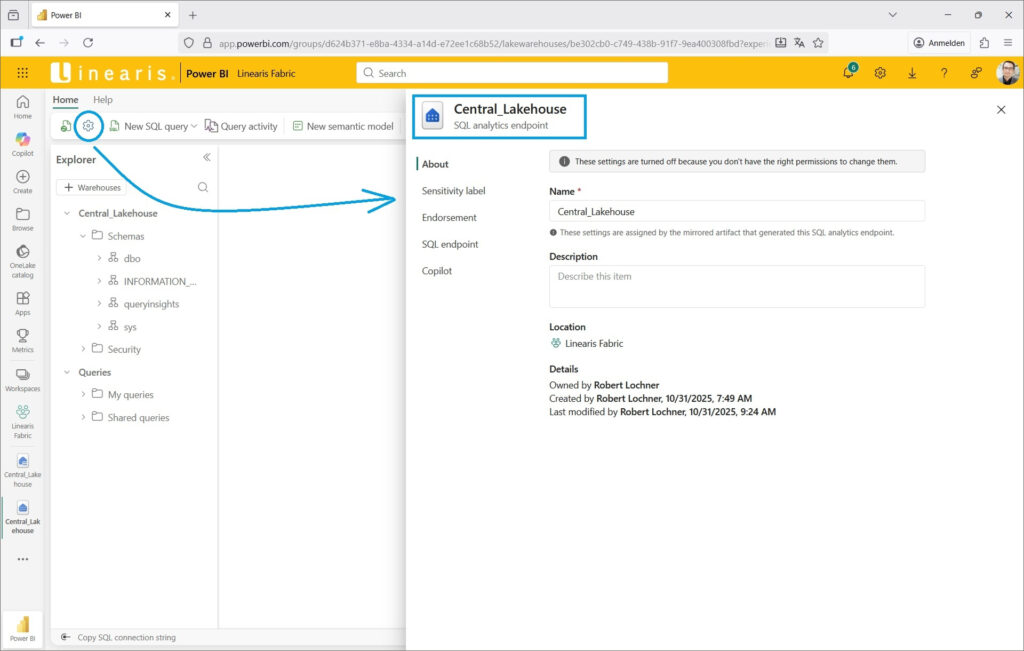 Die Settings des SQL analytics endpoint sind auf die gleiche Weise zu finden ebenfalls noch recht überschaubar: