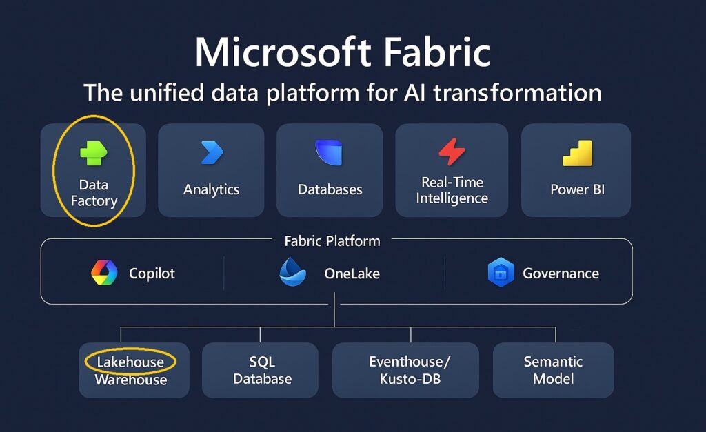 Das Lakehouse ist der zentrale Datenspeicher für analytische Aufgaben in in OneLake und damit in MS Fabric – hier werden alle Daten für BI, KI und Datenanalyse als single-point-of-truth gesammelt. Data Factory ist das ETL / ELT Tool zum Befüllen des Lakehouse mit Daten.