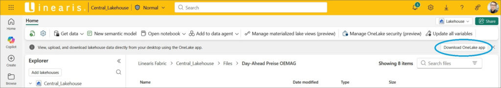 Alternativ kann auch die OneLake App – ein kleines Plugin für Windows – heruntergeladen werden …