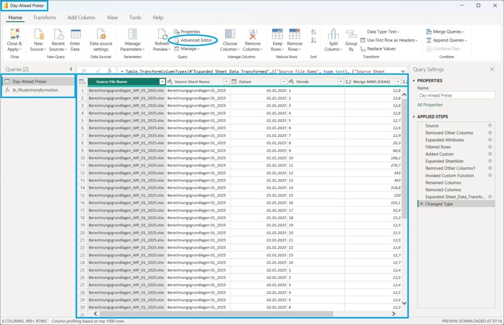 Im zweiten Schritt öffnen wir den Advanced Editor der Query Day-Ahead Preise OEMAG