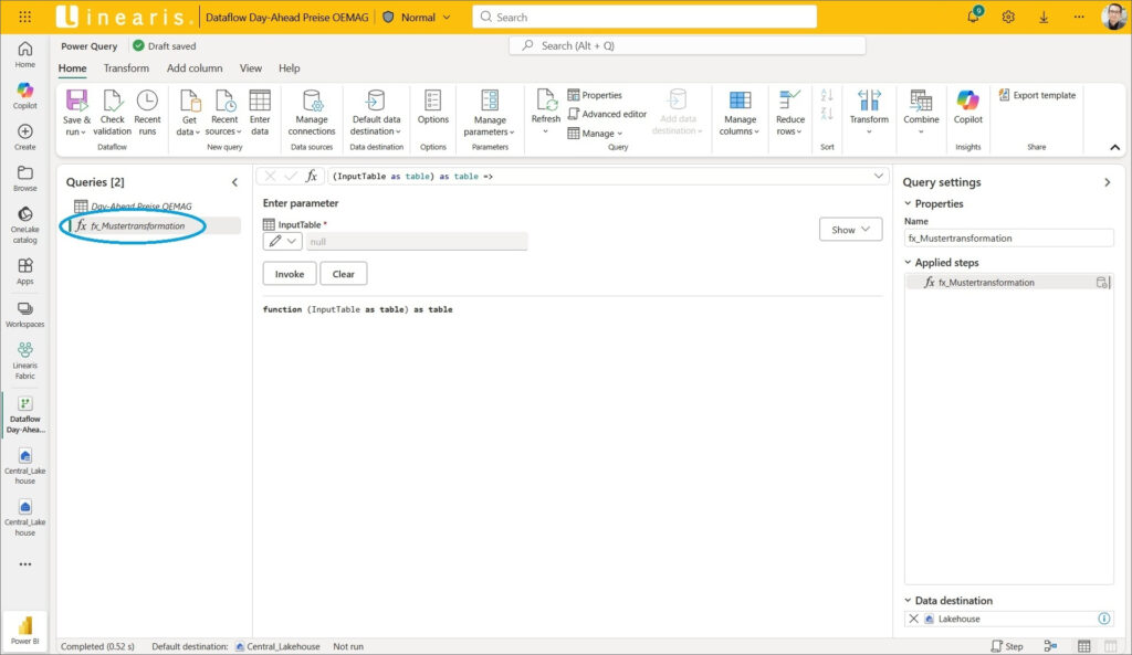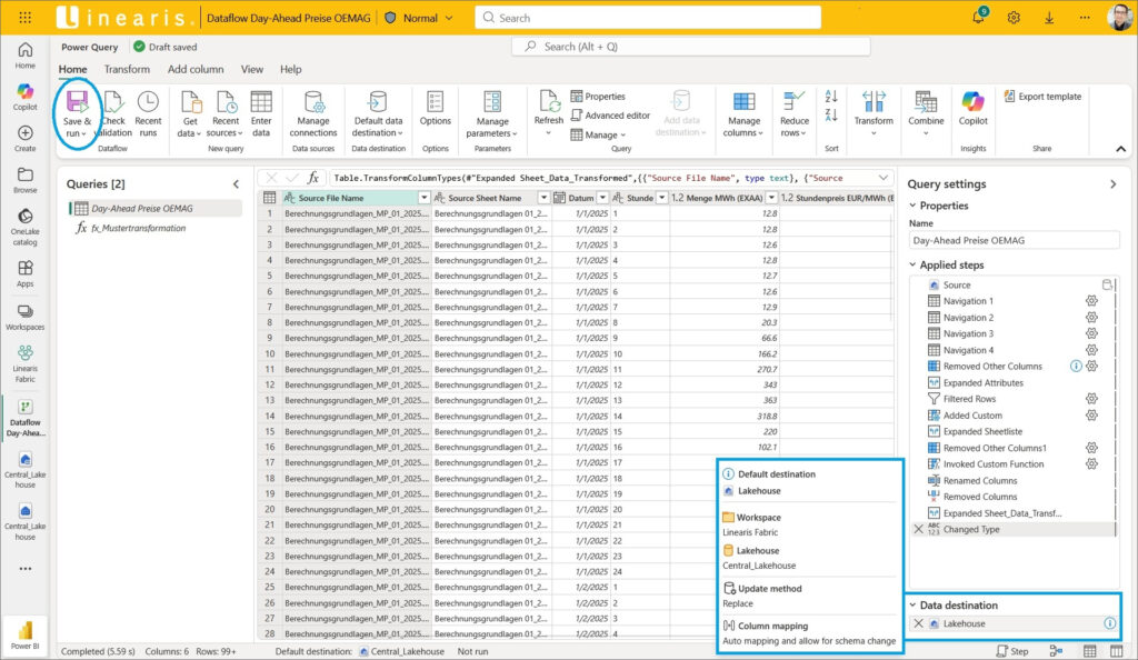 Anders als in Power BI Desktop kann im Dataflow Gen2 das Ziel für die Ausgabe der Daten gewählt werden – in unserem Fall möchten wir die Daten ebenfalls in das Central_Lakehouse ausgeben.