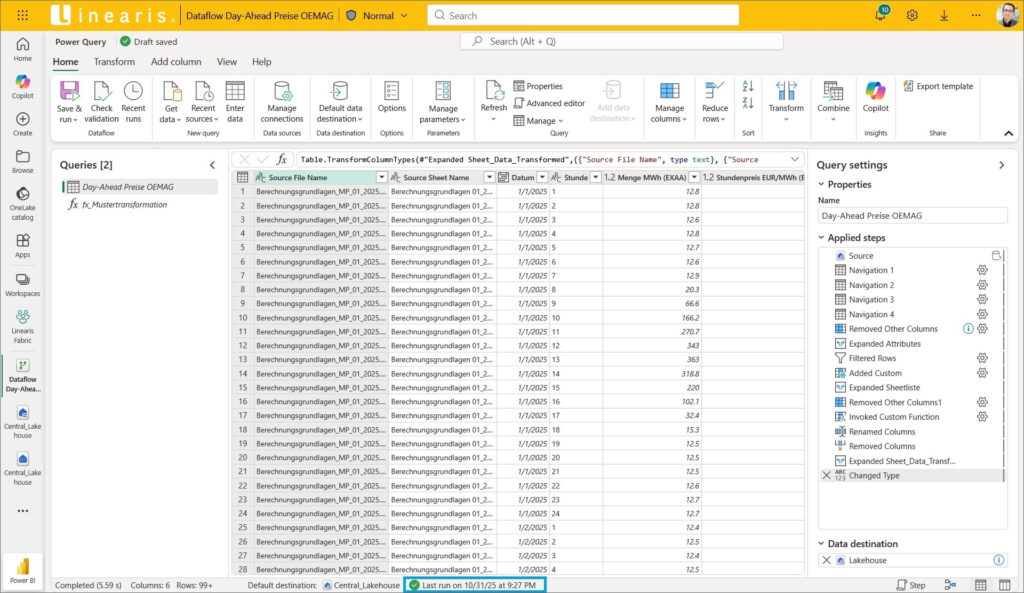 Die Rohdaten liegen jetzt im Lakehouse, im Sinne eines ELT (nicht ETL) Prozesses möchten wir jetzt die Daten für die spätere Verwendung in Power BI innerhalb des Lakehouse aufbereiten. Wir verwenden das Tool Dataflow Gen2, um unsere bereits bestehende Aufbereitung dieser Daten mit möglichst wenig Aufwand aus Power BI Desktop übernehmen zu können. Die Aufbereitung dieser Daten ist bereits aus diesem Blogbeitrag bekannt.