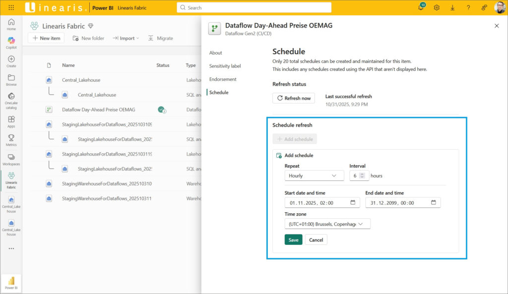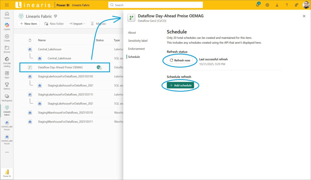Der Dataflow kann – natürlich – entweder manuell aktualisiert werden und/oder mit einem Schedule zur zeitgesteuerten Aktualisierung ausgestattet werden: